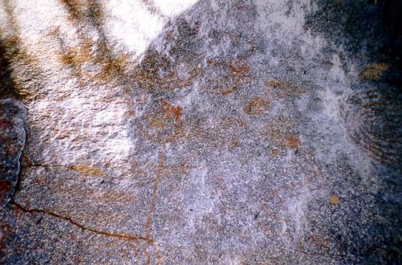 pedra possui várias inscrições rupestres nas cores amarelo e vermelho. As